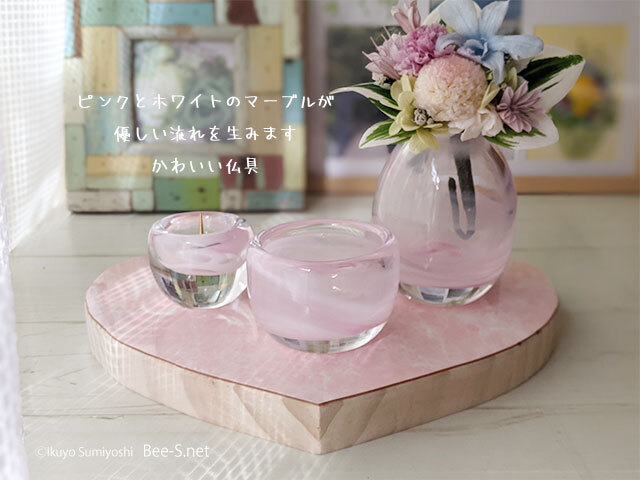 ピンクにホワイトを混ぜることでいちごみるくみたいなかわいらしさをプラスしました。 重厚な仏壇を必要としない方に喜ばれる仏具です。 インテリア的な視点で、好みの色調で仏具を飾ることができるので、どんなお部屋にもマッチします。 一つひとつガラス職人が手作りで制作いたしますので、 世界で2つと同じ柄がないオリジナル商品です。。
