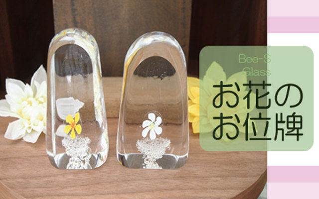 ガラス職人が手作りで心を込めてお作りする当店オリジナルデザインのお花の入ったガラス位牌です。