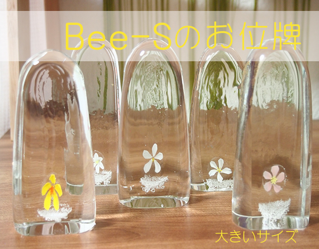 ガラス職人が手作りで心を込めてお作りする当店オリジナルデザインのお花の入ったガラス位牌です。