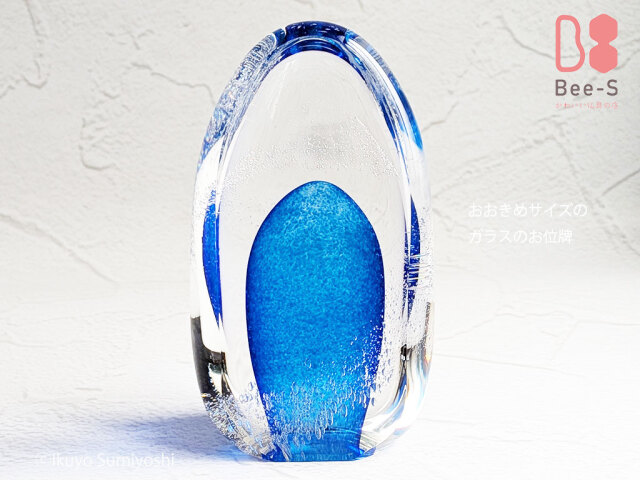 透明感のある海のような濃いブルーがかっこいいお位牌です。手元供養の祈りの場所に、大切なかたにぴったりのガラスのお位牌が輝きます。