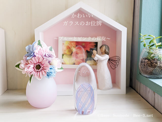 優しいブルーとピンクが螺旋状に空へ大好きをお届けできるようなかわいいお位牌です。手元供養の祈りの場所に、大切なかたにぴったりのガラスのお位牌が輝きます。