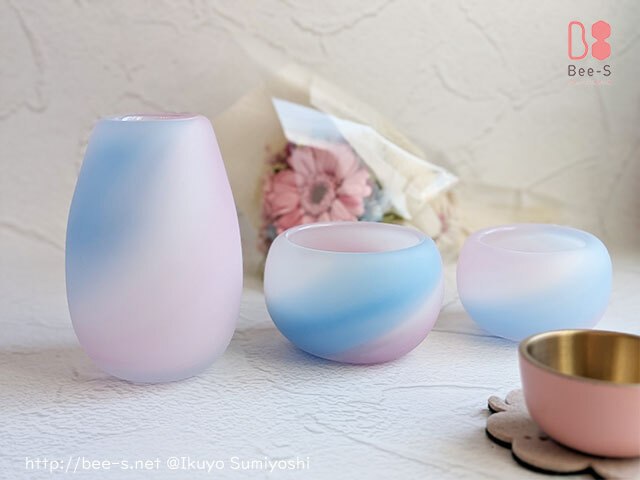 ピンク&ブルー、男の子にも女の子にもどちらにもぴったりくるような、かわいい色の組み合わせのガラス仏具をすりガラスで優しくつつみこみました。