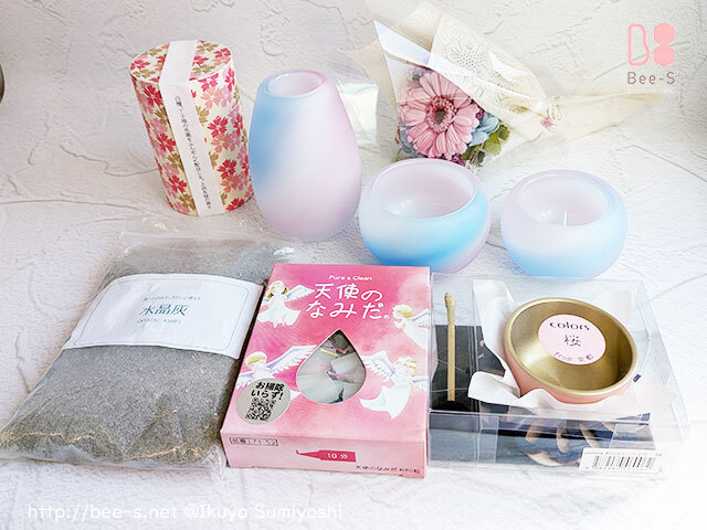 ■ ピンク&ブルーにすりガラスのかわいい仏具3点とおりん、プリザーブドフラワーブーケ、ろうそく、お線香、水晶灰の仏壇セットです