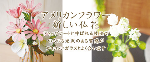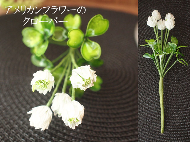 かわいいガラス仏具に合うクローバーのフラワーアレンジメント。こちらのサイズはBee-Sの花立に合うサイズです。 アメリカンフラワーとは、別名ディップアートとも呼ばれています。 ワイヤーを形作り樹脂をまとわせて作ります。 つるつるの質感と優しい色合いはガラスの仏具によく合います。 お手入れが簡単で乾いたタオルで優しく汚れをふき取れば、半永久的に楽しめます。 お花が枯れやすい時期など、アメリカンフラワーがあると華やかさが増します。 小さいサイズのフラワーアレンジ