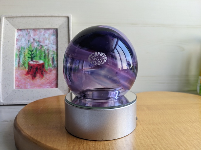 紫とピンクの仏具SHIONと同じ色柄出作ったおとなかわいい盆ランプ。6色に変化する台座がガラスの色を変えてくれ、見飽きないかわいらしさです。
